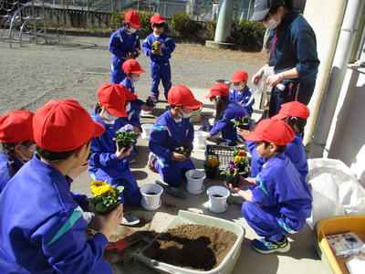 子供たち一人一人が、一鉢の花を育てます。毎日お世話をして心を込めて大切に育てましょう。今日は1年生が色とりどりのパンジーを丁寧に植えました。ぐっと集中して植える子供たちです。