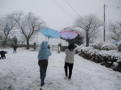雪が降りました。明日2月6日は、2時間遅れとしました。滑らないように気を付けて登校してください。昼休みの子供たちは大喜びで雪遊びをしました。