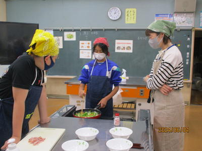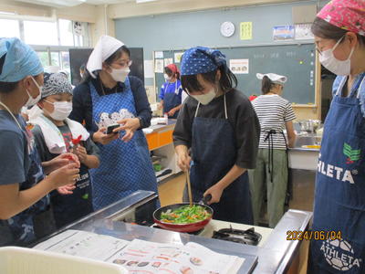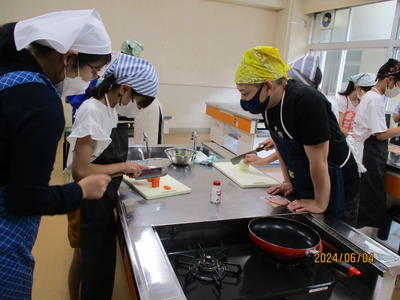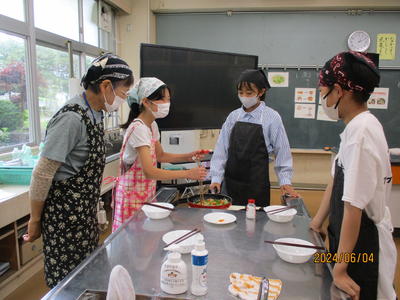6年生が家庭科「朝食から健康な1日の生活を」の学習で、朝食のおかずを調理実習しました。SSVの方々に入っていただきながら、切り方、いためる順序、火加減に注意していためる調理をしました。