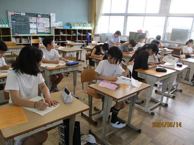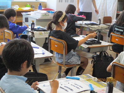 4年1組で道徳の研究授業を行いました。アンケート結果によると、いらいらした気持ちを全員が経験したことがある子供たちです。教材「深く息をすって」の登場人物の変容から、いらいらを言動で表現するよりも、心を落ち着かせて節度ある言動をすることで、自分も周りの人も気持ちよく生活できることに気付きました。学校保健委員会で学んだ心を落ち着ける方法も子供たちから出てきました。一ノ宮小の4年生の先生にも参観してもらいました。