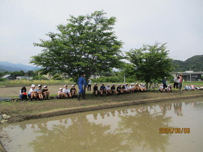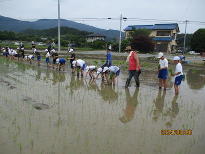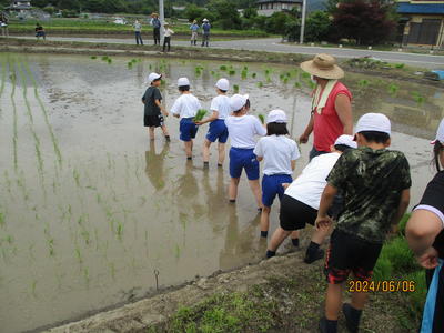 5年生が田植え体験をしました。吉田地域づくり協議会の皆様による、ふれあい田んぼ事業です。5年生が毎年米作り体験をしています。津金澤さんがあぜをきれいに作り直してくださったそうです。