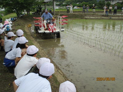 田植え機は人の50倍の速さで稲を植えていきます。等間隔に稲を植えていく技術に子供たちは歓声をあげてみつめました。