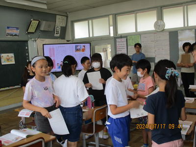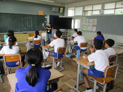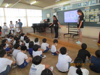 七夕集会を行いました。クラスの代表児童が七夕の願いを発表しました。そして、計画運動委員の子供たちは、七夕クイズを通して七夕を紹介してくれました。子供たちの願いのつまった素敵な集会でした。最後に新しいALTジョサミー先生の紹介をしました。