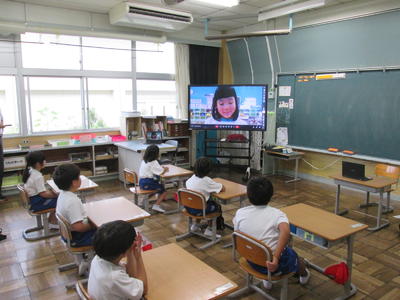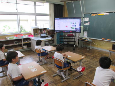 5年生がオンラインで一ノ宮小、丹生小の5年生と交流会をしました。一ノ宮小の総合的な学習の時間の発表を聞いて、丹生小と吉田小の子供たちは質問や感想を話しました。5年生は2学期には赤城宿泊体験学習で2日間の合同学習を行います。3校の子供たち同士の交流が始まりました。