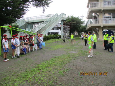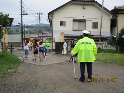 交通少年団の6年生による街頭活動が行われました。交通安全協会のみなさん、交通指導員のみなさんに参加していただき、交通事故に気を付けて安全な登下校をすることを呼びかけました。夏の全国交通安全運動スローガンは「家庭でもみんなで語ろう交通ルール」「自転車も止まって確認曲がり角」です。