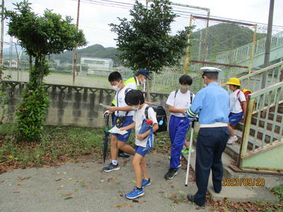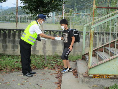 明日から秋の全国交通安全運動が始まります。今朝は交通安全協会と交通指導員さんのご協力で子供たちの登校に合わせて啓発活動を行いました。