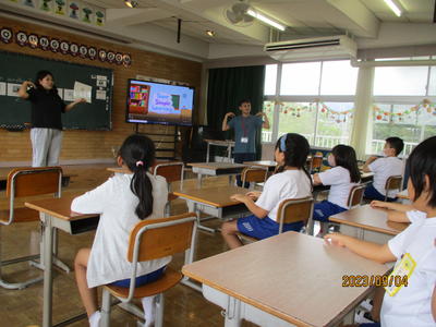 昼休みにファングリッシュタイムが行われました。今日のファングリッシュタイムは1年生と2年生が、ALTのシャイラ先生とジェリック先生と遊びます。新しくなったファングリッシュルームで楽しい時間を過ごしました。