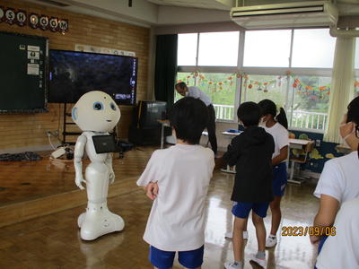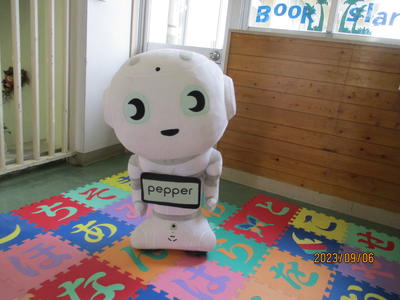 ペッパーくんを連れてICT支援員さんが来校しました。学校のICTサポートや子供たちへの支援もしていただきます。休み時間にもペッパーくんと遊んで楽しむ子供たちでした。