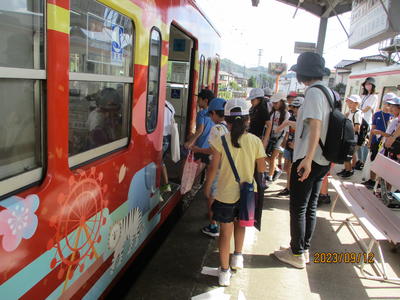 3年生が社会科見学にヤオコー富岡店に行きました。上信電鉄を利用して南蛇井駅から出発です。マンナンライフ列車に乗って出発しました。SSVの方も一緒に行ってくださり、心強い社会科見学です。
