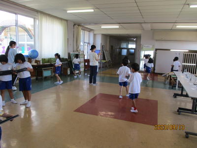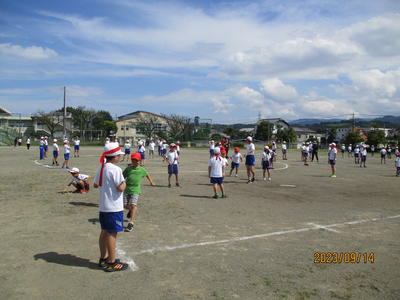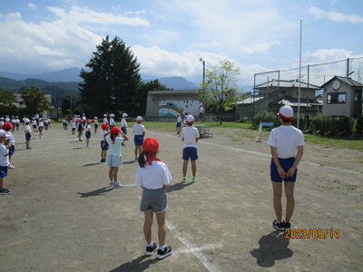 全校児童で運動会練習をしました。団役員の声かけで、全校児童が整列します。暑い中ですので、熱中症予防のため8分と短時間の全体練習でした。運動会の準備が進んでいます。どうぞ子供たちの頑張る姿をご期待ください。