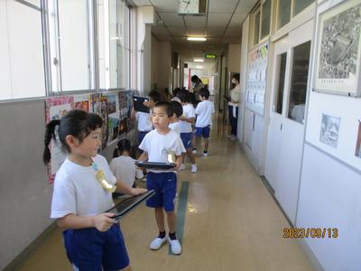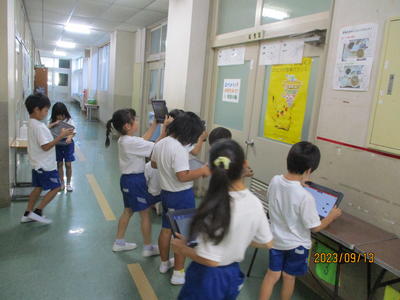 1年生がタブレットを持って学校の中のカタカナを探しています。見付けるとタブレットで写真を撮って記録します。教室に戻り、見付けたカタカナを発表しました。