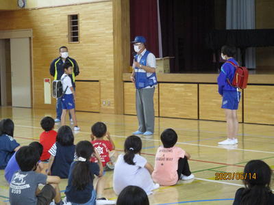 教室に不審者が入ってきて危険な時にどのように子供を守るか、富岡警察スクールサポーターと南蛇井駐在所巡査部長、スクールガードリーダーを講師に、職員と子供たちの避難訓練を行いました。避難が無事に済んだ後には、登下校中に声をかけられたら、声をかけられている友達を見たらどうすればよいかを考えました。とにかく逃げる、大人に助けを求める、子ども安全協力の家に逃げ込む、「助けてー」と大きな声を出すことを、教わりました。