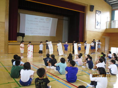 子供たちによる人権集会が行われました。各クラスの代表児童による人権宣言が発表され、クラスで人権を守るということについてよく話し合ったことが伝わってきました。そして、吉田小学校の人権宣言 〇私たちは自分を大切にします 〇私たちは一人一人を大切にします 〇私たちは仲良く協力し合います 〇私たちは毎日をみんな仲良くすごします を、みんなで確認しました。