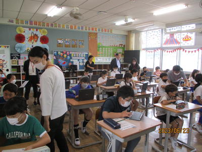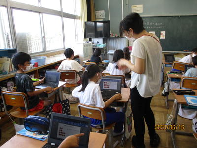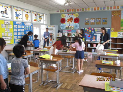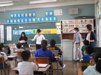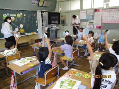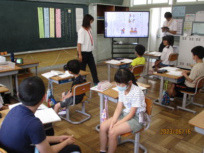 4年生の外国語活動の授業をGBS総研の方々が見に来てくださいました。担任を含めて4人の指導者の支援を受け、明るく元気に自信をもって話す子供たちです。