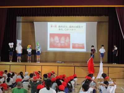 保健委員会と給食委員会の子供たちが、学校保健委員会発表集会を行いました。全校児童を対象に、〇✕クイズで歯肉炎予防についての理解を深めました。古代からの転校生役の子供たち、ナレーションの子供たち、〇✕クイズの解答担当の子供たち、楽しく堂々と発表をしてくれました。