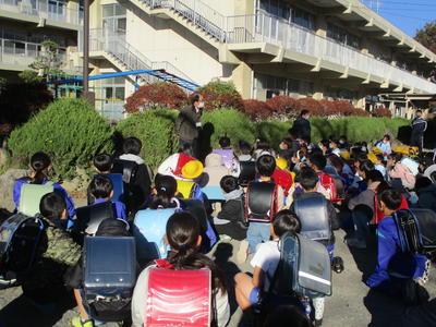 集団下校を行いました。班長が先頭になり静かに集合することができました。班長さん毎日ありがとうございます。スクールガードリーダーより、縁石に登ったり、車道に飛び出したり、登下校中は遊びながらでは危ないとお話をいただきました。横断歩道では大きく手を上げて自分がいることを運転手に見せることも大切と教えていただきました。交通事故ゼロを続けましょう!