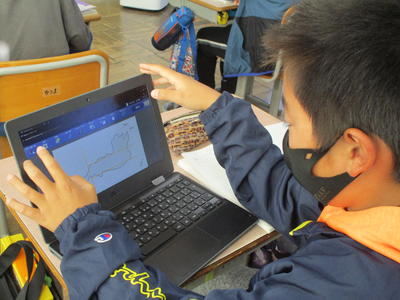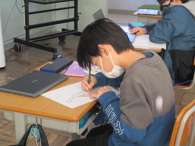 6年1組で算数「およその面積や体積」の研究授業を行いました。琵琶湖の面積を求めることになった子供たち、三角形としたり、台形としたり、四角形にしたり、方眼紙を使って数えたりと多様な方法を考えました。友達の考えを聞きながら、説明し考えながら、面積の求め方を深めることができました。