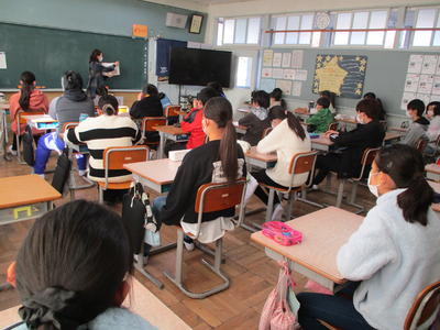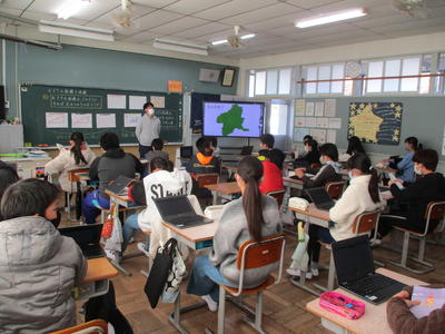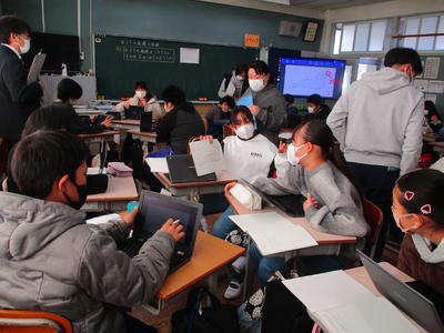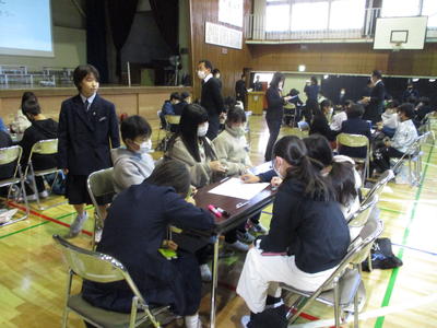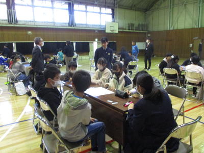 吉田小、一ノ宮小、丹生小の6年生が西中学校に集まり、まるごと留学を行いました。西中学校の紹介や学校見学、いじめ防止子ども会議が行われました。西中校区の小中学校で子供たちが気持ちよく学校生活を送るためになにができるか、各校の発表があり、中学生をリーダーとした班別協議が行われました。班別協議では、挨拶をすること、明るく元気な返事をすること、言葉遣いに気を付けること、相手の長所や短所を認め合うこと、みんなで助け合うこと、相手の気持ちを考え個性を尊重すること、感謝の気持ちを伝えること等、西中校区の代表として、各校のリーダーとして充実した話合いが行われました。