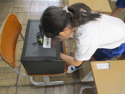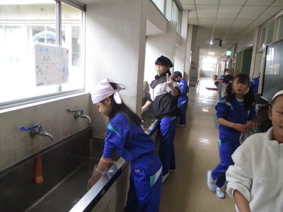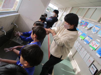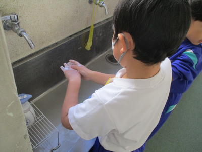 1年生が学級活動で「手洗いはどうして大切なのか」をめあてに、手の洗い方を勉強しました。手の汚れに見立てた魔法クリームを塗って、魔法ボックスで手を見ると汚れが紫色に光ります。子供たちは手を洗うと、もう一度魔法ボックスに手を入れます。汚れの落ちていないところを見付けると、また一生懸命洗います。手洗いの大切さがよく分かった子供たちでした。