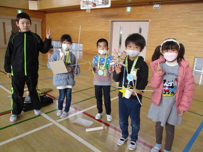 2年生が生活科でおもちゃ発表会をしました。司会進行も運営も2年生が進めます。まずは1年生を招待して遊びました。そして、いずみこども園の年長さんも来てくれました。2年生が作ったおもちゃで遊び、2年生からたくさんプレゼントをもらい、1年生も年長の子供たちも楽しそうに嬉しそうに過ごしました。2年生楽しいおもちゃ発表会をありがとう!頑張りました。