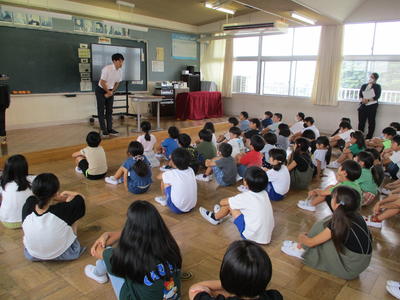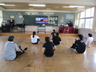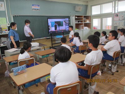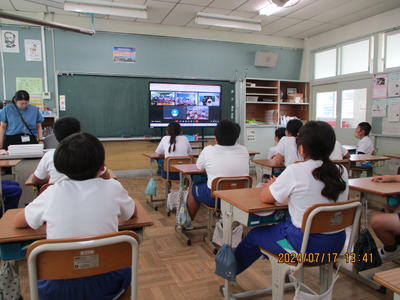 5年生がオンラインで一ノ宮小、丹生小の5年生と交流会をしました。一ノ宮小の総合的な学習の時間の発表を聞いて、丹生小と吉田小の子供たちは質問や感想を話しました。5年生は2学期には赤城宿泊体験学習で2日間の合同学習を行います。3校の子供たち同士の交流が始まりました。
