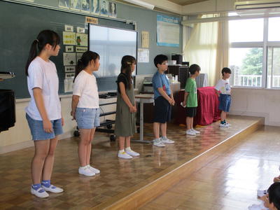 71日間の1学期が終了しました。熱中症予防のため音楽室にて終業式を行いました。吉田小学校校歌を元気よく歌い、クラスの代表児童の1学期頑張ったことの発表を行いました。子供たち一人一人が自分の1学期を振り返り、つぎのめあてをたてて、しっかりと節目を迎えていることに感心しました。安全と健康に注意して38日の夏休みを健康に過ごしてください。