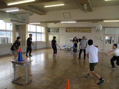 甘楽富岡地区小学校体育実技講習会が行われました。オンラインで体育指導についての講話を受けながら、実技を通して研修しました。内容は中・高学年のネット型ボール運動についてです。実技を通して、子供たちがより楽しく、よりチームが協力できる体育指導について研修しました。