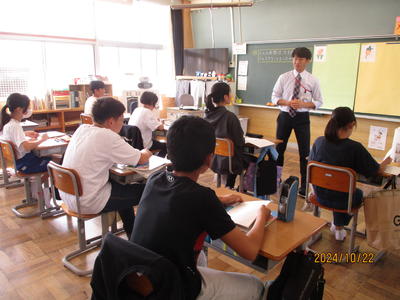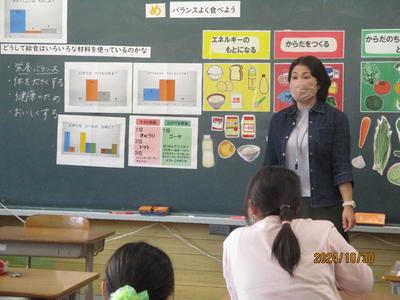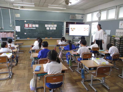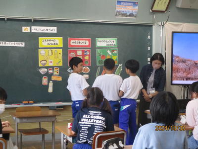 4年生が富岡市給食センターの栄養教諭をお迎えして、食事をバランスよく食べることの大切さを学習しました。子供たちは今日の給食に使われている食材をエネルギーのもとになる食材、体を作る食材、体の調子を整える食材の3つに分けました。体をつくり、健康で、元気よく活動でき、そしておいしくいただくには、食材のバランスが大切だと気付きました。苦手な食材にも挑戦してみる気持ちをもった子供たち、今日の給食をいつもに増しておいしくいただきました。