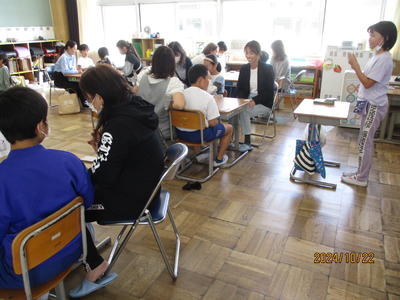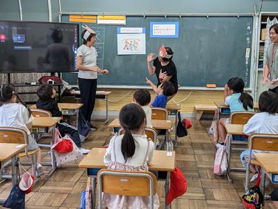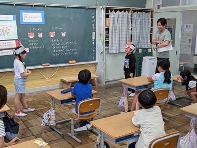 担任、養護教諭、スクールカウンセラーの3名と、1年生の子供たちで、「きもちのよいあいさつ」について学習しました。