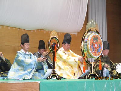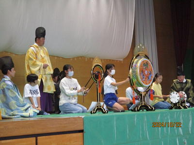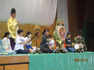 PTA家庭教育委員会主催の「雅楽演奏会」を行いました。群馬県雅楽愛好者会の皆様をお迎えして、全校児童と保護者、学校運営協議会の皆さんと雅楽と舞を鑑賞しました。6年生も太鼓・鞨鼓・鉦鼓の演奏に挑戦しました。雅楽に由来する言葉も教えていただき、日本の生活の中に根付いている雅楽を感じました。心安らぐ響きを聴きながら清々しい時間を過ごしました。群馬県雅楽愛好者会の皆様、PTA家庭教育委員会の皆様ありがとうございました。