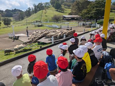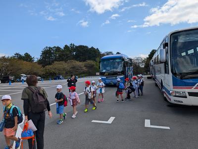 1年生と2年生が全員揃って元気よく秋の旅行に出発しました。伊香保グリーン牧場で楽しい1日を過ごします。元気よく、仲よく、楽しく行ってきてください。いい天気です。