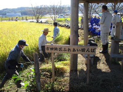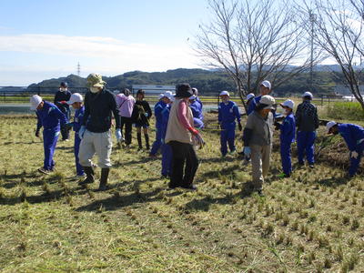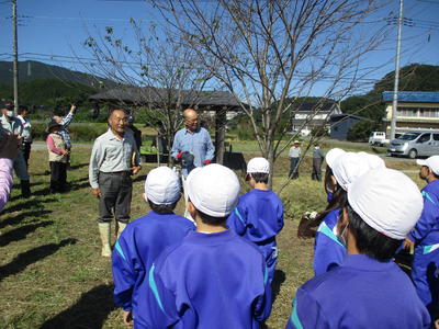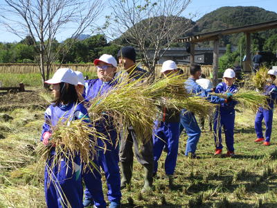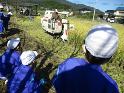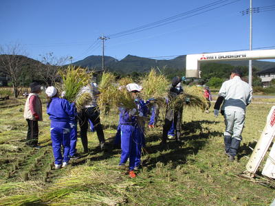 5年生が稲刈りをしました。鎌を持つのも、稲刈りも初めての経験です。稲を刈り、コンバインに稲を運び、率先して稲穂を拾う子供たちの姿をみて、お米の大切さに気付く大切な体験学習だと感じました。地域の皆様、貴重な体験と大切な学びの機会を子供たちに創り出していただきありがとうございました。
